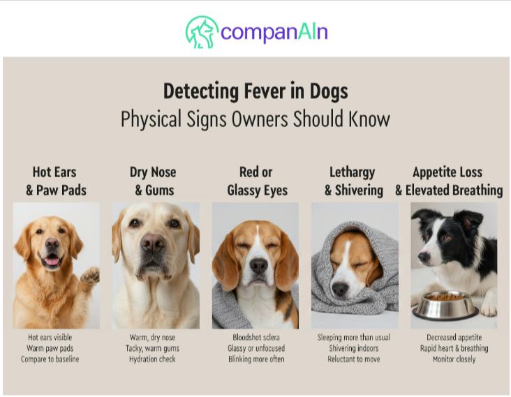 Physical markers suggesting fever include hot ears and paw pads, a warm dry nose, red or glassy eyes, and warm tacky gums. Behavioral changes like lethargy, shivering in warm environments, decreased appetite, and elevated respiratory rate at rest also indicate probable fever. According to VCA Animal Hospitals, while these signs suggest elevated temperature, only rectal thermometry confirms diagnosis and determines severity.