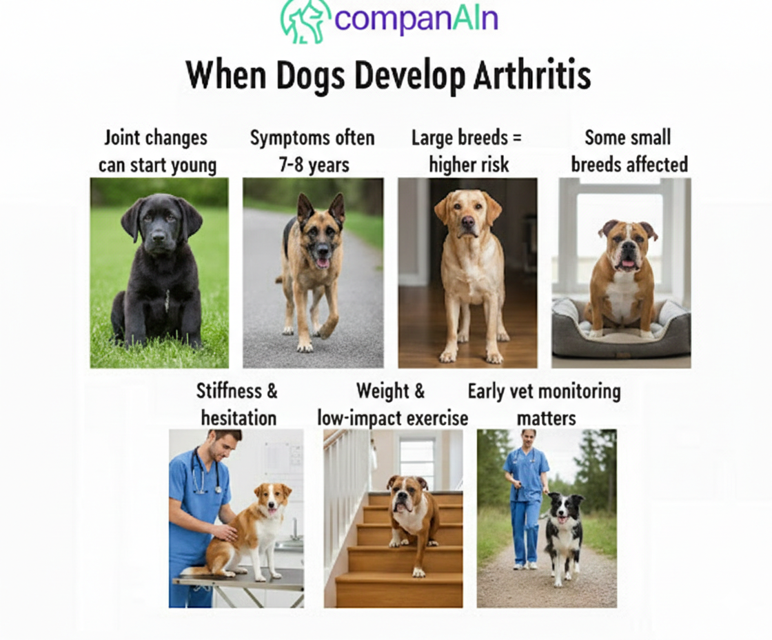 What age do dogs get arthritis in practical terms? Around one in five shows signs before their first birthday. For most, visible symptoms emerge between ages 7 and 8, though larger breeds experience problems earlier due to increased joint stress.